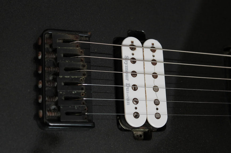 This guitar features two white Seymour Duncan humbuckers , locking tuners , hardtail bridge and a coil tap!
